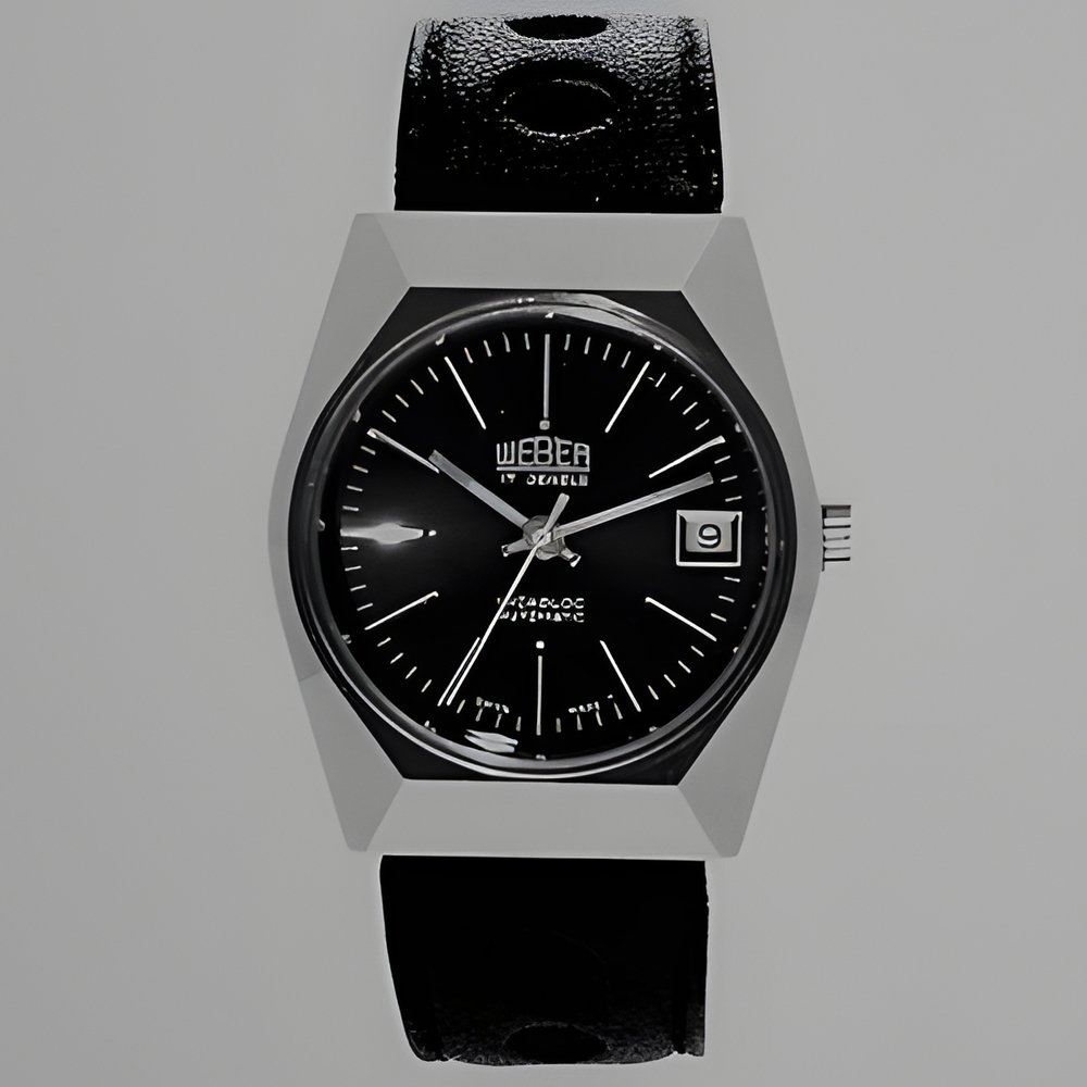 Straight lines are back as this man’s watch demonstrates Jewelled lever selfwinding movement with calendar. Water-resistant chromed or gilt case (WEBER-Misalla)