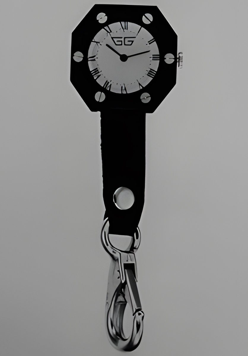 An attractive novelty item is this chatelaine watch It can be hung from the belt by a strong snap-hook, carried in the handbag or even worn normally on the wrist. Roman numerals on the dial, bezel with visible screws (much in vogue this year). An economical model. (GISIGER-GREDER - Eden)