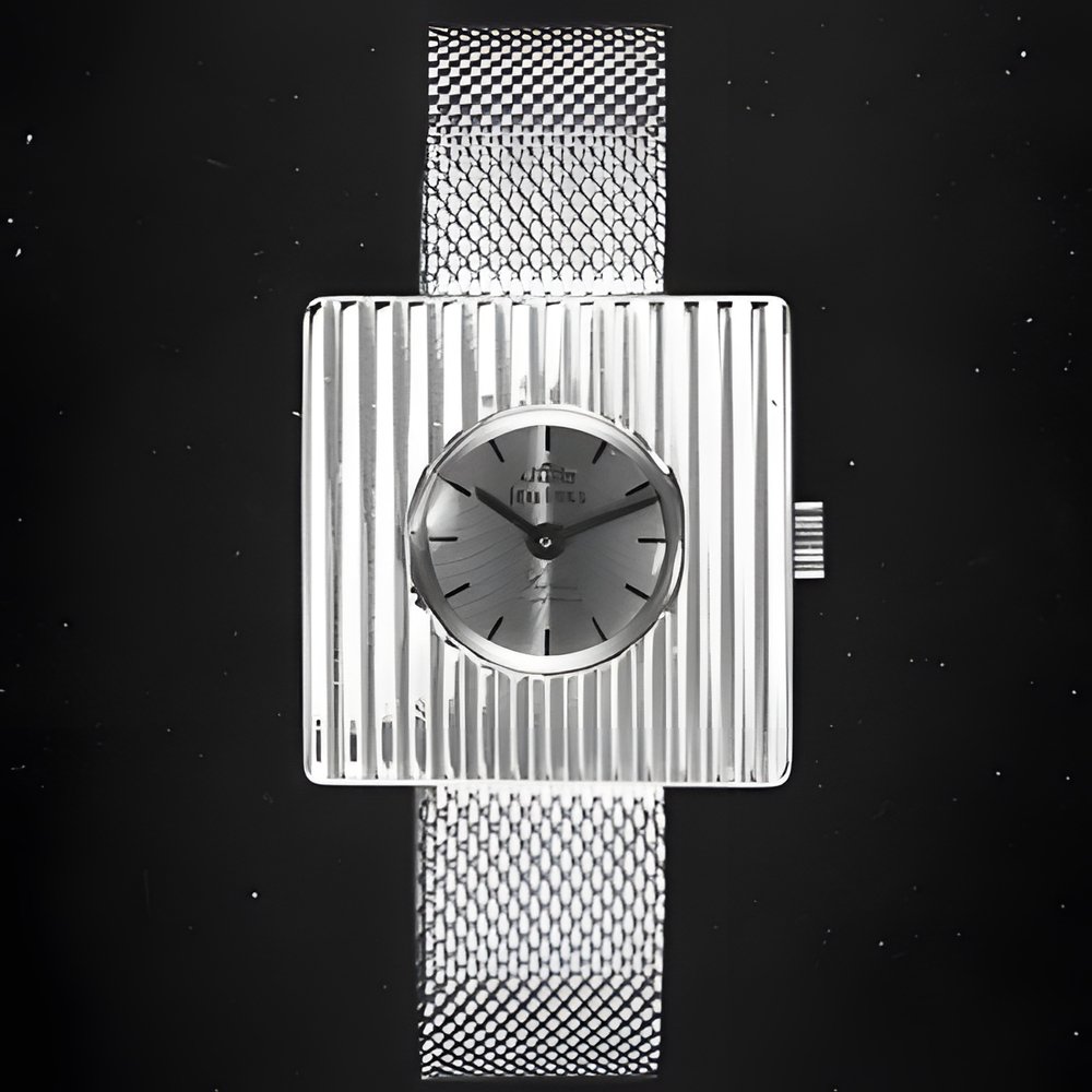 Large square case with vertical godroon pattern, slim mesh bracelet an economical watch, yet fitted with a shock-protected 17-jewel fulllever movement. Gilt finish and champagne dial. (JOWISSA)