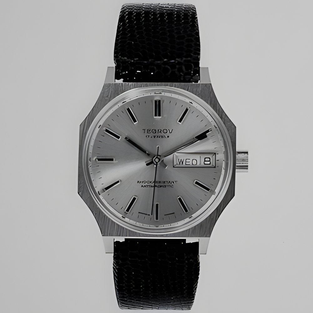 Economical watches too display the firmer, bolder styling popular nowadays. This model with mechanical movement features a 6-sided water-resistant case and a “sunray” pattern brushed dial. With day and date calendar. (SCHAUB-TEGROV)