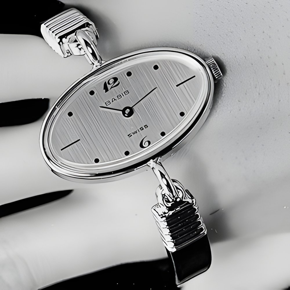 Timely fashion for the younger set : broad oval dial ; slim rigid bracelet in imitation ebony. The ingenious case-to-bracelet links also serve as decoration. An economical model. (BASIS)