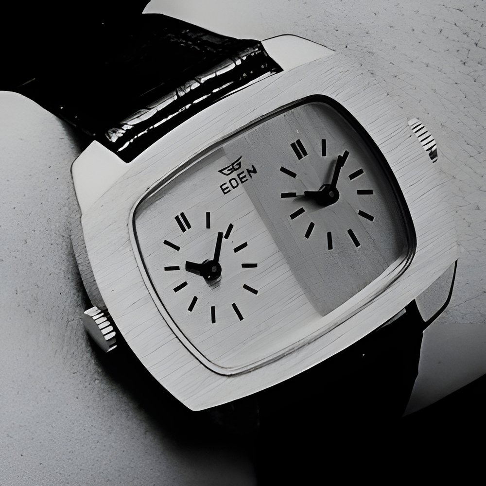 That’s right: two dials. One for local time, the other for the time zone of your choice: GMT, Mecca time... A useful plus for airline hostesses, travel agents, travellers ... Or simply to keep a neighbouring country’s summer time in mind. All this at an attractively economical price too. (EDEN - Gisiger-Greder)