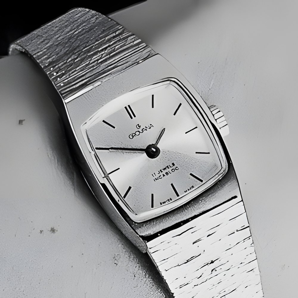 The all-round, wear-everywhere watch for the younger set. Integrated gilt case and bracelet, silvered dial with twelve hour strokes. (GR0VANA)