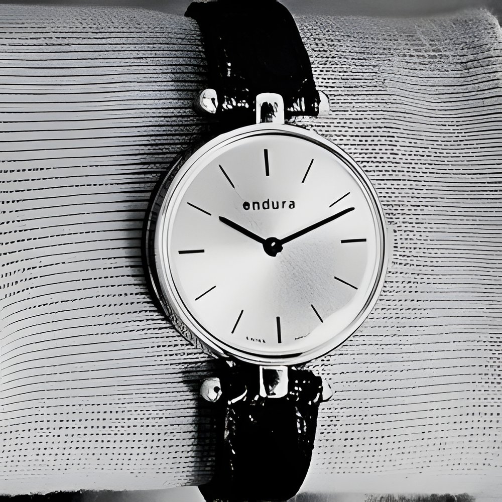 One of this year’s fashion highlights : stirrup-type case-to-bracelet links, here underlining the gilt case’s classic elegance. With gilt dial and black hour markers. An attractively priced entry for the youth market. (ENDURA)