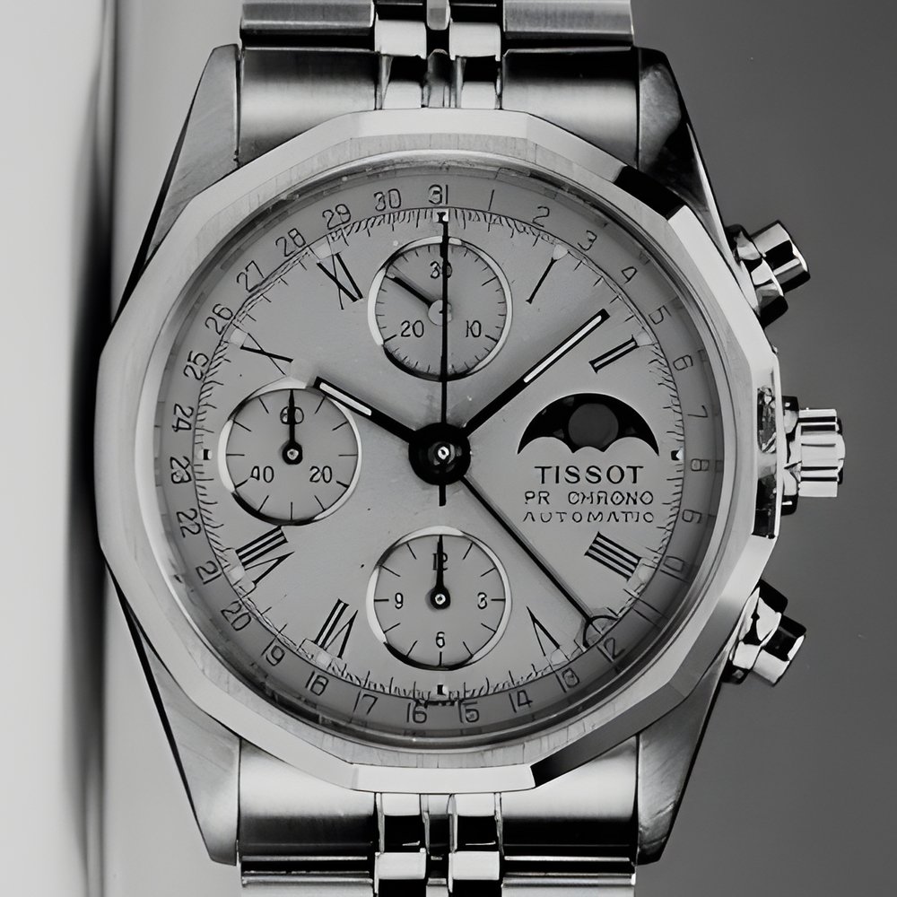 A masterful movement from Tissot : this new mechanical chronograph includes the phases of the moon along with a timer to 1/5th second plus minute and hour totalisers. Circular date calendar. All-steel or two-tone case water-resistant down to 100 m, with screw-lock crown. Scratch-resistant sapphire crystal. (TISSOT “Chronographe PR 100”)