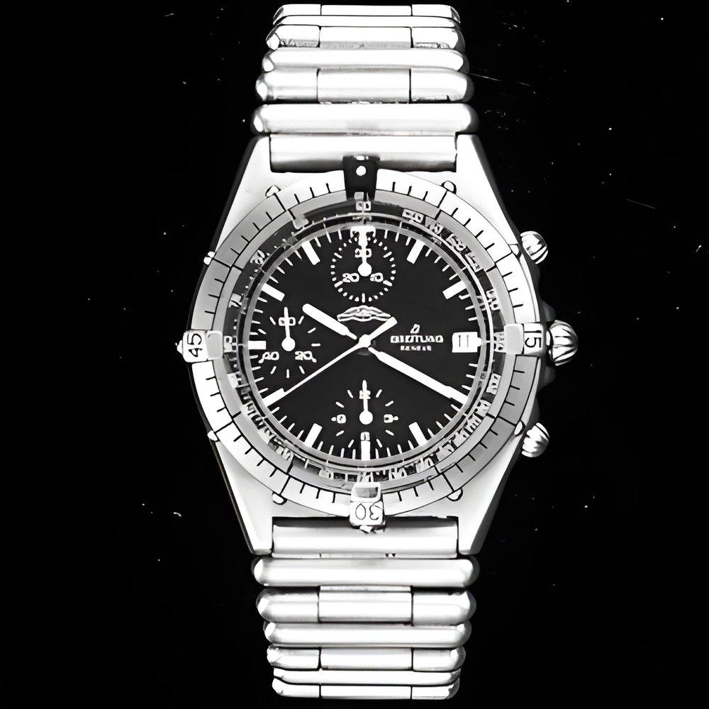 European Watch Clock and Jewellery Fair 1984 BF 205 Selfwinding chronograph for pilots and navigators. Along with hour, minute and second totalisers, it features an hour ring divided in hundredths, a tachometer and a graduated rotating bezel. All-steel case water-resistant down to 100m and screw-lock crown. (BREITLING “Navitimer Chronomat”)