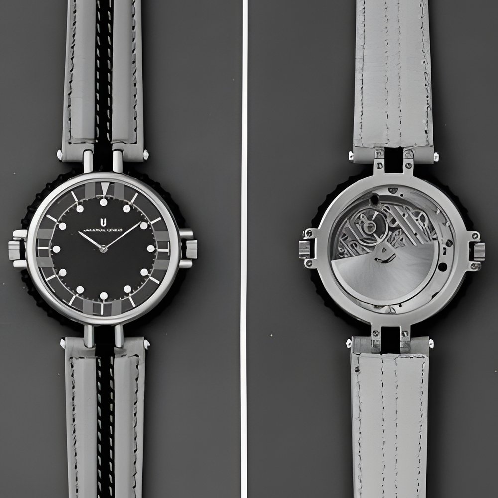 Super-sports wristwatch water-resistant down to 100 m, with inner rotating bezel. Case in steel with fluted pattern. 20-micron goldplated claw-clamps and bezel. Extra-thin selfwinding movement visible through the clear, scratch-resistant case back. (UNIVERSAL GENEVE “Golden Shadow”)