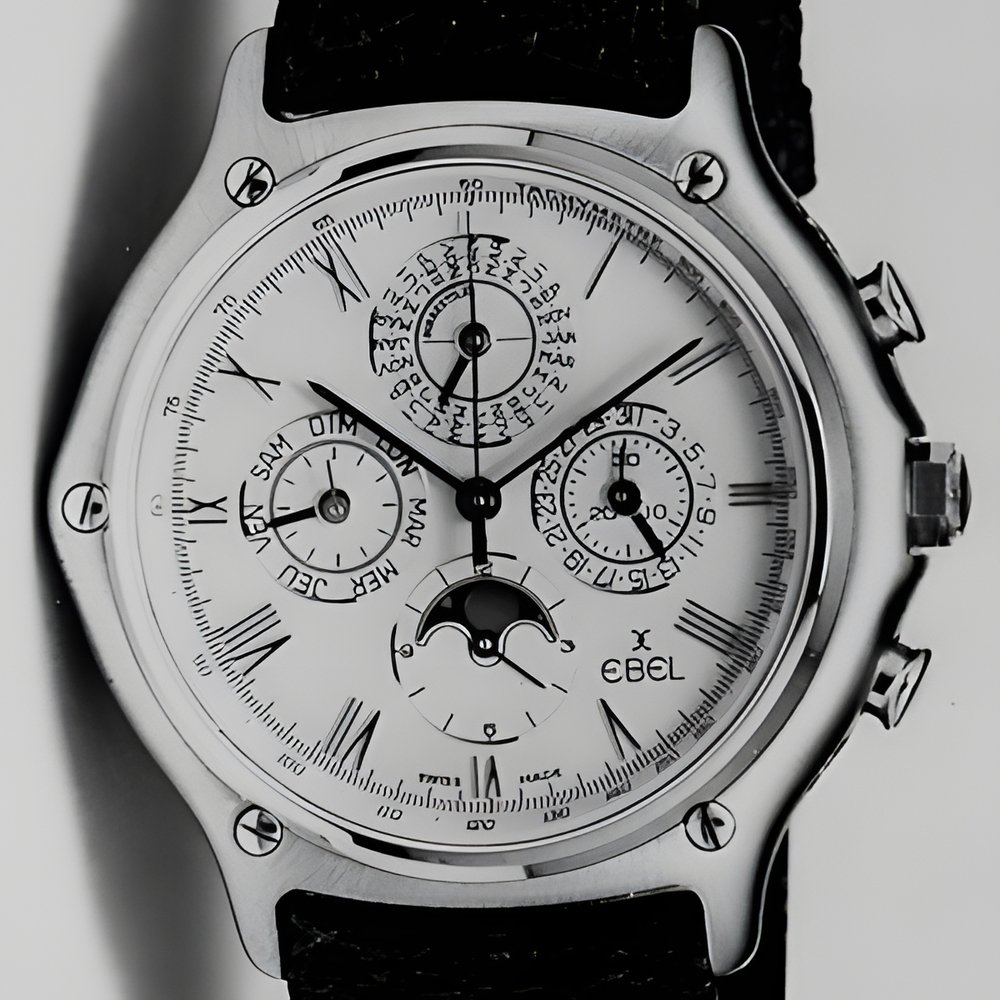 Chronograph with perpetual calendar. Automatic movement, 36 000 vibrations/hour. Seconds (1/10th), minutes and hours totalizers, indication of day, date, month, leap year and moon phases. Water-resistant down to 30 meters. (EBEL)