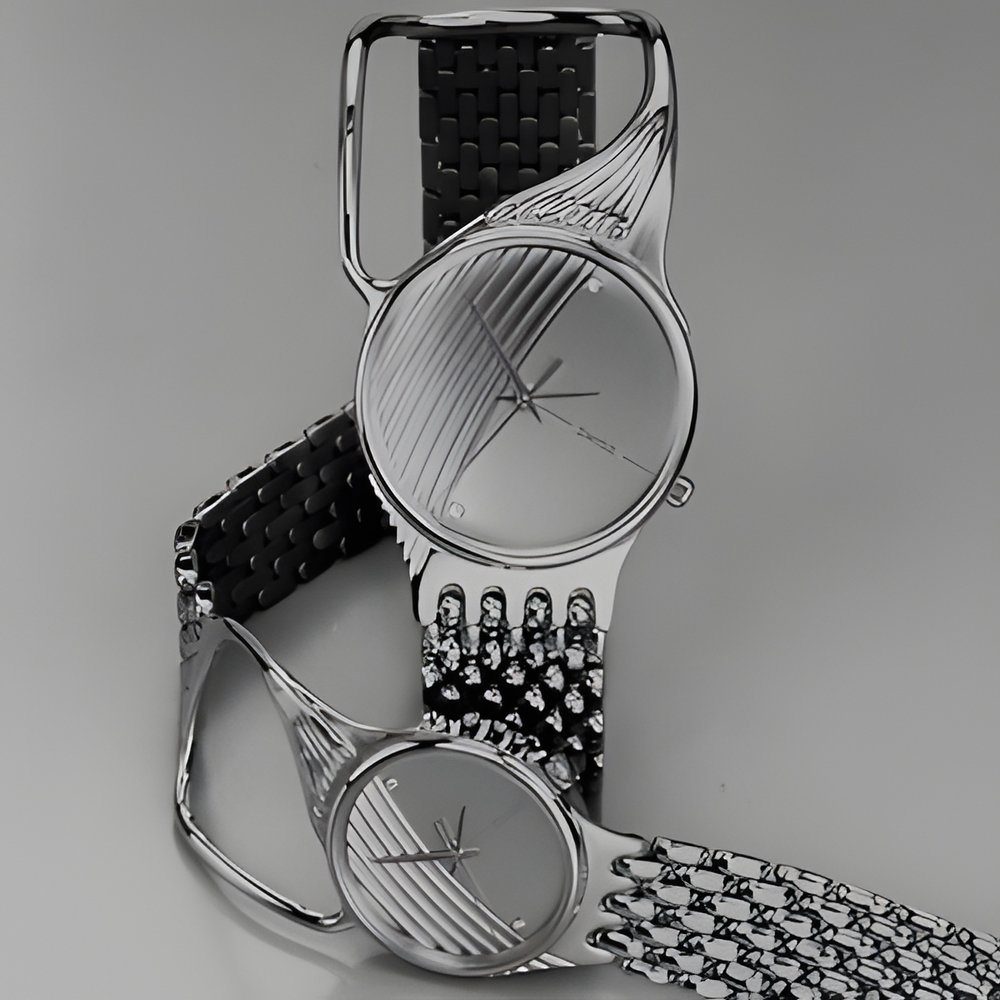 Thanks to the aperture in the bracelet accommodating the tip of the ulna bone, these “Ulna 1” models - created by the designer Luigi Colani - fit diagonally on the wrist providing a direct reading of the time. Waterresistant cases in 18K gold, with gold dial set with two diamonds. Limited edition series, numbered 1 to 1,000. Choice of quartz or mechanical movement. (LUIGI COLANI, Müller & Co AG, Oberdorf)