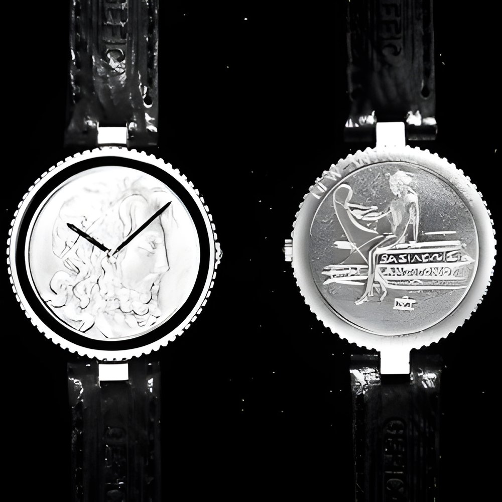 To add a characteristic touch to his “Alexander-Gefica” line, Gerald Genta has designed “New Antique”, a timepiece in homage to the spirit of Classical Greece. With selfwinding or quartz movement. (GERALD GENTA, Geneva)