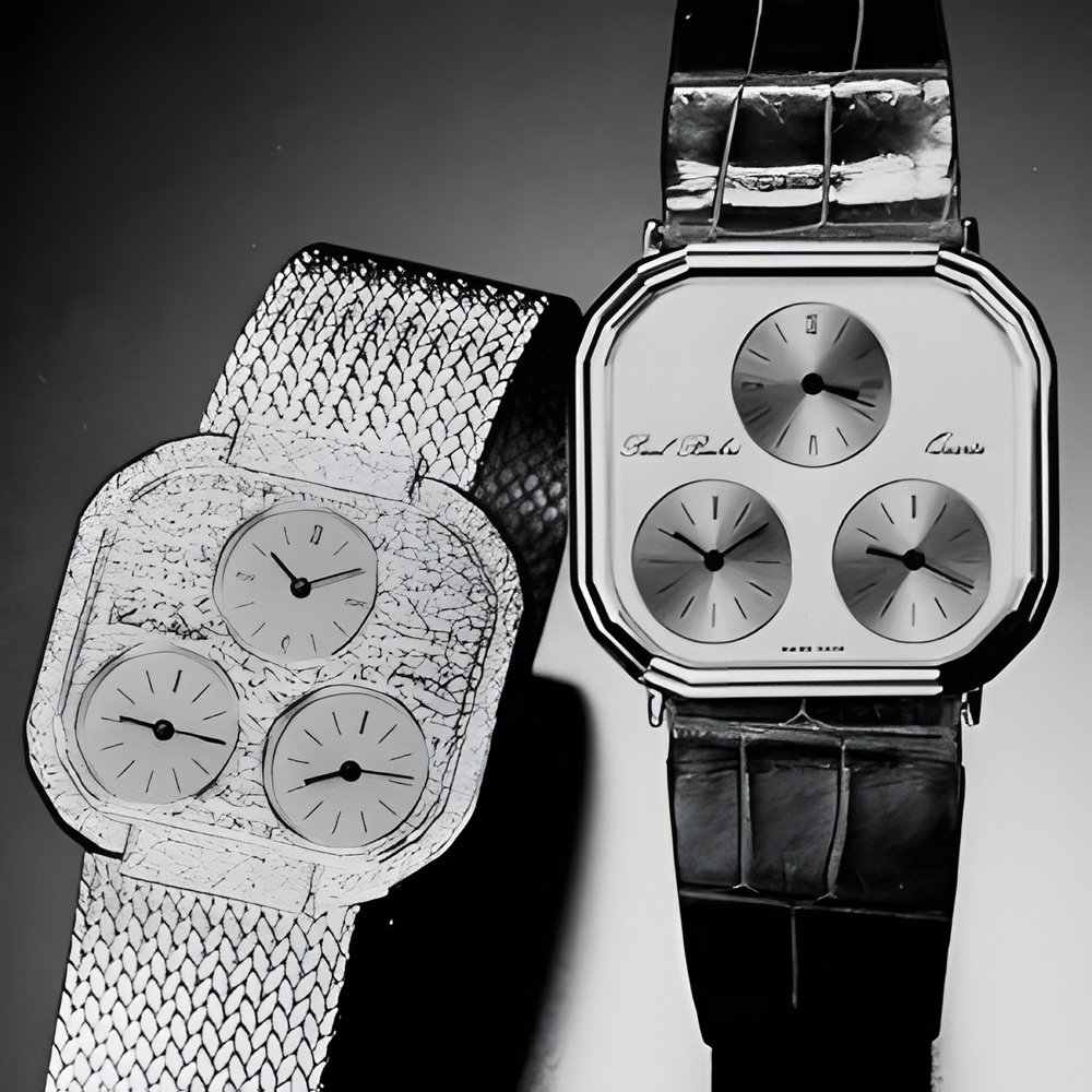 lhe time in three timezones simultaneously. Each dial is individually controlled by an extra-thin and ultra-compact quartz movement. 18K water-resistant case attached to a gold or alligator strap. The model at left also features brilliant-cut diamonds. (PAUL BUHRE)
