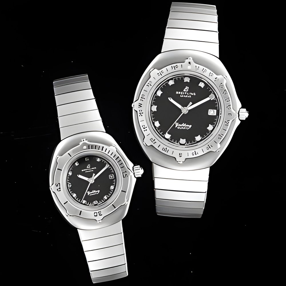 A pair of stylish yet functional sports models designed for sailors, navigators and divers. Dial with excellent legibility even at great depths. Unidirectional rotating bezel with time or navigational graduations. Water-resistant down to 100 m, with screw-lock crown and sapphire crystal. Quartz movement with centre seconds and calendar. (BREITLING “Cup”)