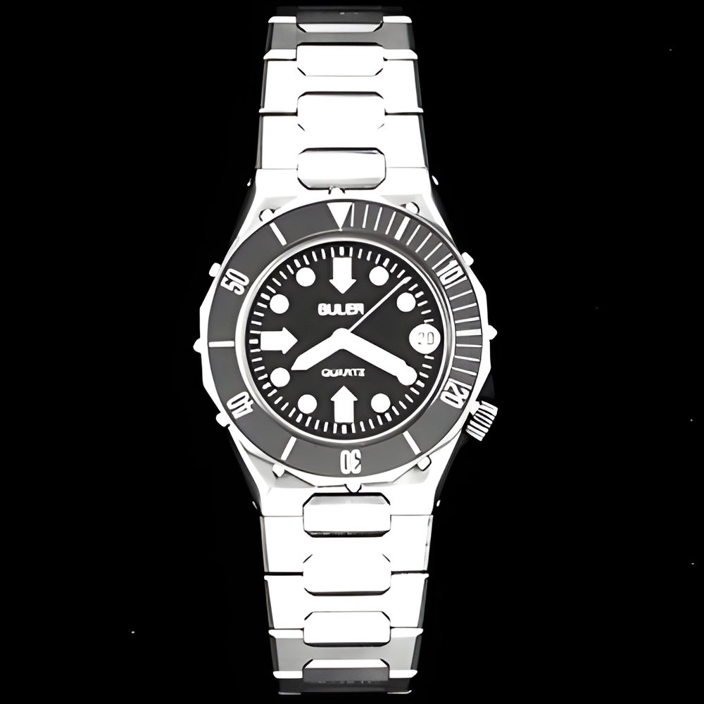 Sports watch with “Officially Certified Quartz Chronometer” certificate attesting its technological excellence. Ali-steel case water-resistant to a depth of 100 m (each watch is individually tested). Rotating bezel, mineral crystal and bracelet with two-tone styling. Crown in the 4 o’clock position. Extra-thin movement. (BULER Quartz)