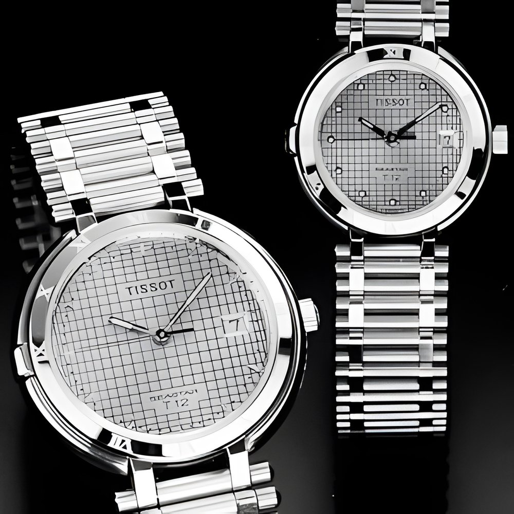 The Tissot sports watch “Seastar” features extra-slim lines. Quartz movement, water-resistant to 120 m. Flawlessly integrated bracelet. Bezel engraved with Roman chapters. Two two-tone versions : steel and yellow goldplate or black metal and goldplate. (TISSOT “Seastar”)
