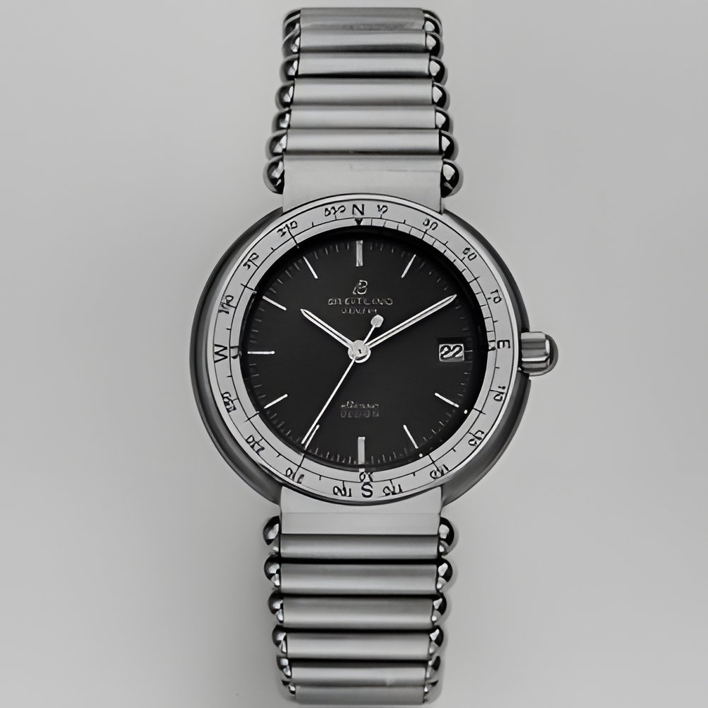 A model developed jointly by Breitling engineers and designers from the styling department of [liesse, the noted maker of quality sportswear. It displays a highly original bracelet and case-to-bracelet link.The all-steel or two-tone case is water-resistant down to 200 m. Unidirectional rotating bezel for greater safety, designed specially forsailors and navigators. Special dial for nighttime reading. (BREITLING “Ellesse”)