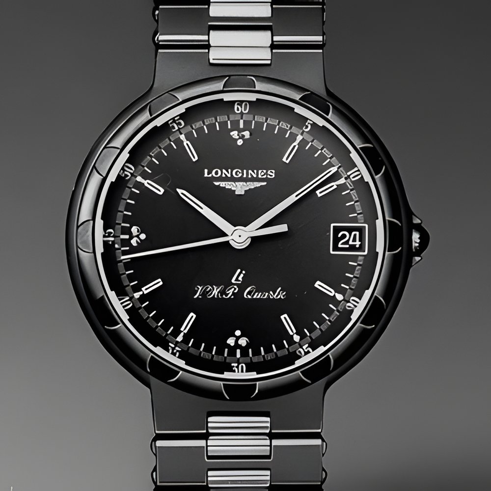 Longines VHF (Very High Precision) : 5 years of untroubled reliability and perfect accuracy. Its lithium battery has a minimum operational life of 5 years and its rate will vary at most one minute during that same five-year span. Its 32 KHz quartz timebase is monitored by a second “thermometer” quartz vibrating at a rate of 262,144 Hz, which measures the ambient temperature and directly corrects the watch’s rate by means of non volatile correction memories. Steel case clad in a special chrome-nickel-aluminium alloy. Water-resistant down to 30 m. (LONGINES VHP)