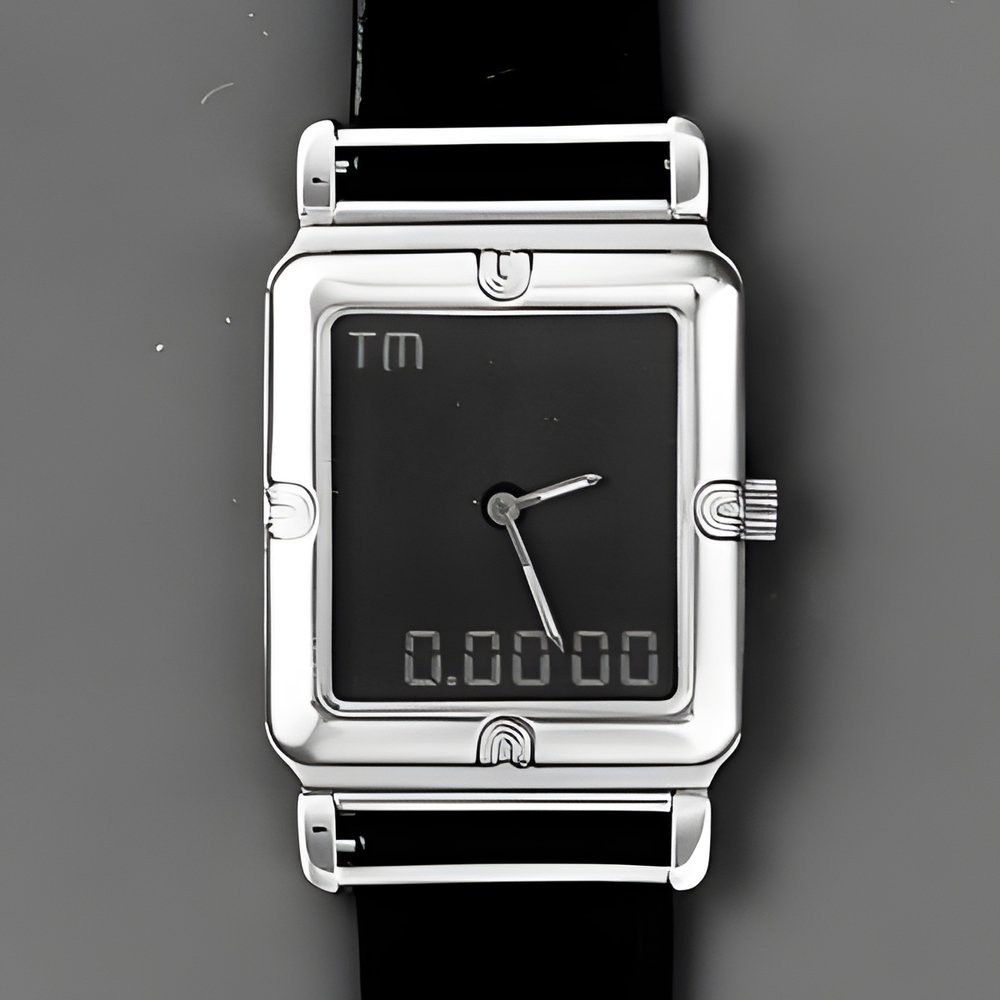 In Basle this year, Universal Genève presents the first upmarket dichroic-display timepiece. Featuring a steel and 18K gold waterresistant case with mobile bracelet attachments, this stylish design becomes a multifunctional time instrument merely by action-ing the crown (no pushpieces) to turn its dial into an electronic display screen. Functions : chronograph to 1/100th second, countdown timer, alarm, timezone selector, day-date calendar programmed over a 4-year period. (UNIVERSAL GENEVE)