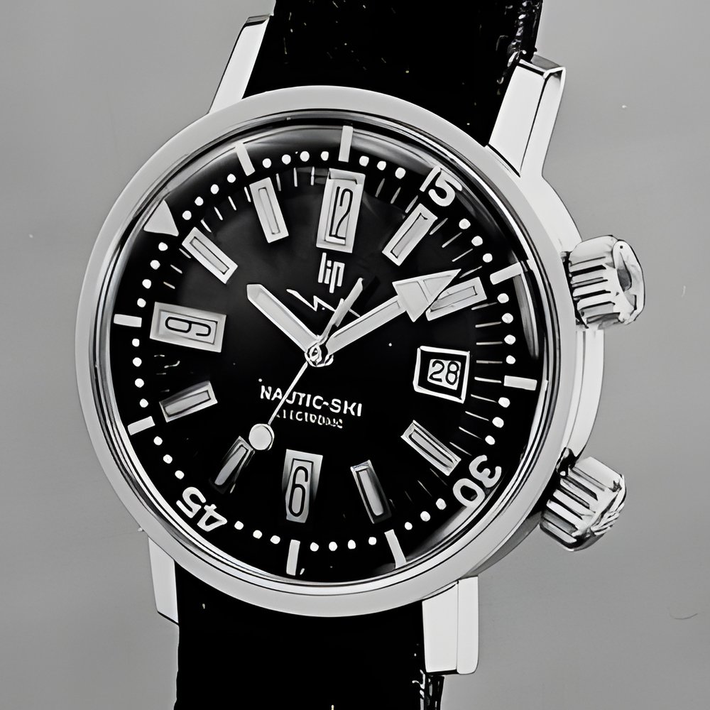 Here’s the first diving watch with an electric movement. Case watertight to 20 atmospheres (660 feet), rotating interior glass controlled by one of the two buttons Calendar device. The battery works for up to i B months (LIP “Nautic-ski”)