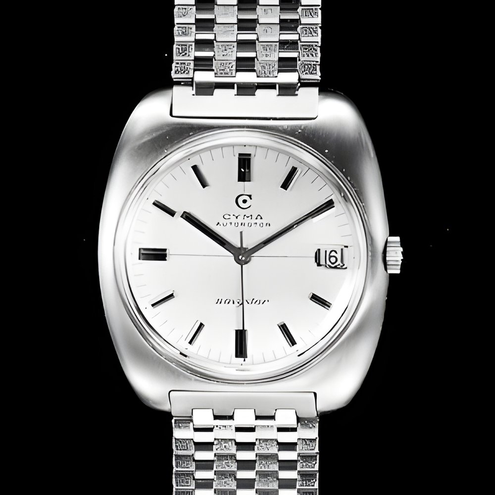 Dress or sports watch - but incorporating the waterproofing techniques of diving watches. Its steel or gold-plated case is designed to withstand a pressure of 5 atmospheres, i. e. a depth of 50 meters (150 feet). Selt-winding with calendar. Bracelet in hammered steel. (CYMA-Navystar)