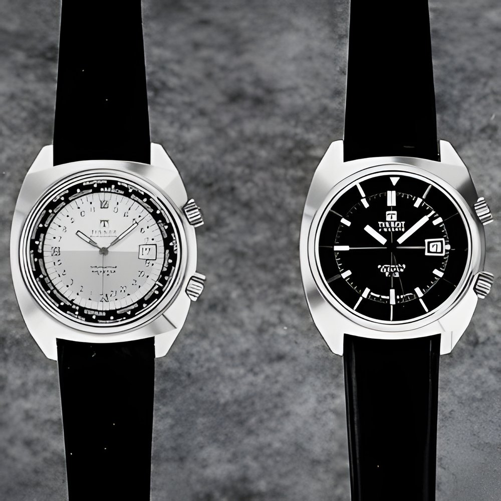 Tissot presents a series of functional “technical” watches at the Basle Fair. From left to right: T 12 Chronograph with waterproof case, hour, minutes and seconds totalizers and tachymetric scale; T 12 Navigator giving universal time, 24-hour dial, automatic movement with calendar, waterproof case; T 12 Diver guaranteed to 396 feet, turning inner-bezel, automatic with calendar. (TISSOT T 12)