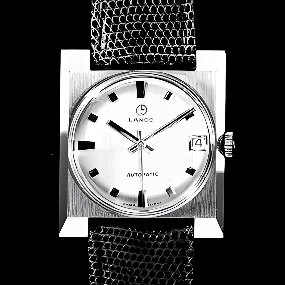 A really masculine watch with a square shape and boldly chamfered surfaces. The bracelet joins the waterproof case with no break in the line of the styling. Automatic movement with calendar device. Stainless stool case. (LANCO)