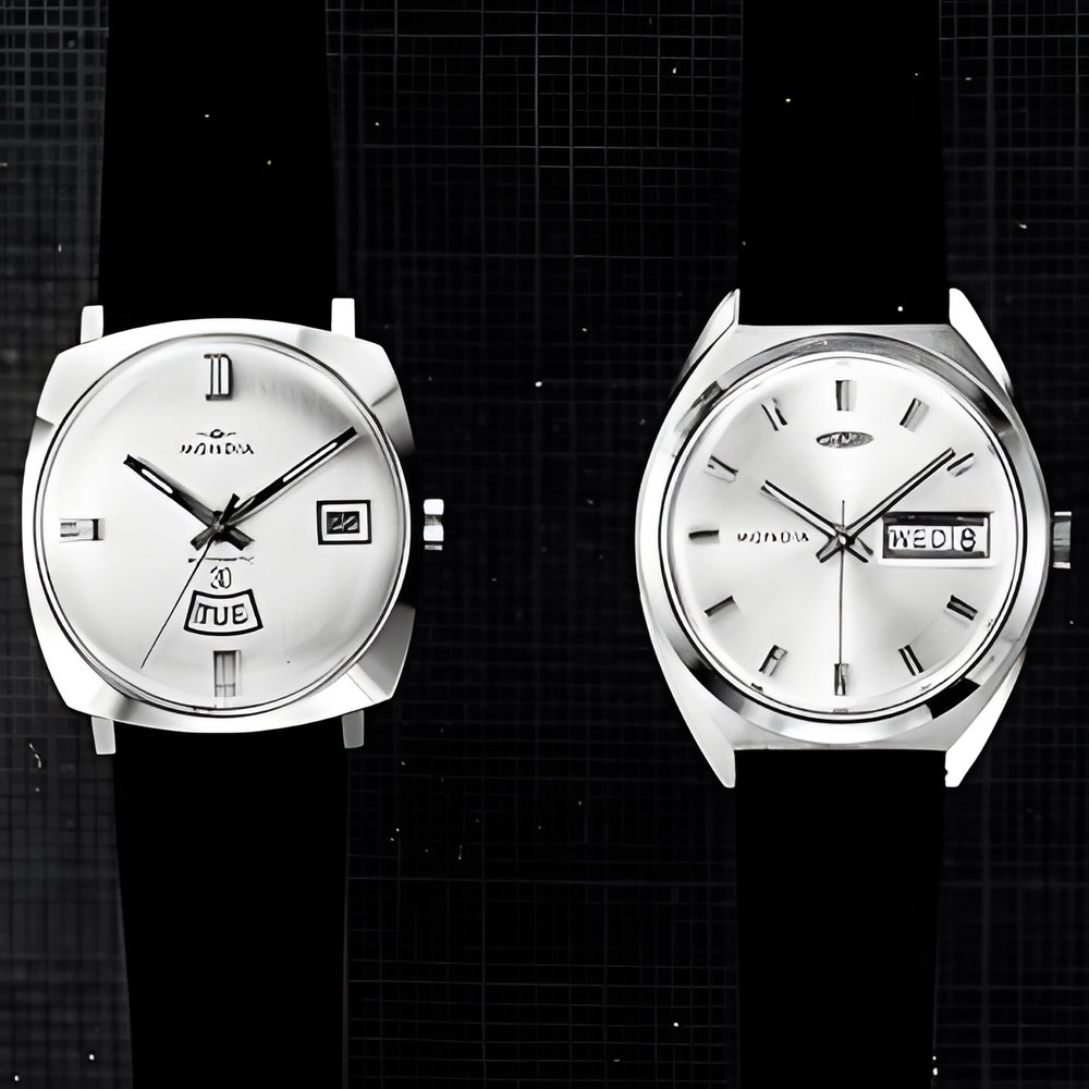 The self-winding watch featuring day-and-date calendar is much in demand this year. There are three different versions with horizontal but separate apertures, separate apertures on a different radius or else day and date joined in a single window. All three models are waterproof with steel or gold-plated case. Note how the bracelet loads into the case on the “Skystar 1967” model. (MONDIA)