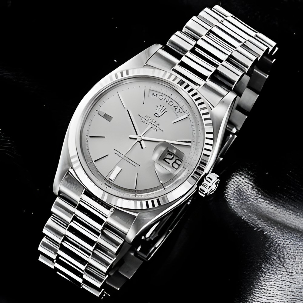 Rolex has had a day-and-date equipped watch on the market for over ten years This is a full decade’s advance since only this year at Basle has the system been widely adopted. This “Day-Date” model has enlarged, easy-to-read windows. Steel or gold case, waterproof, automatic. (ROLEX “Day-Date”)