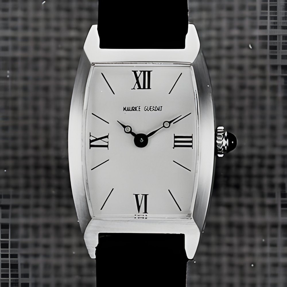 This 18 ct. large ladies’ watch embodies all the charm of the “Belle Epoque” style with its soft-lines. Roman numerals and cabochon set in the winding-crown. (MAURICE GUERDAT)