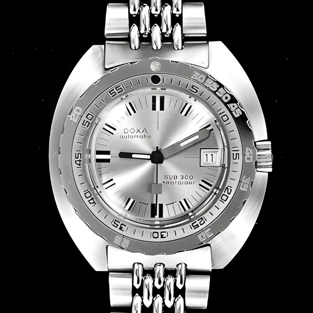 This diver’s watch is specially designed for professional use. Case guaranteed to withstand a pressure of 30 atmospheres, screwed-in winding-crown and turning bezel with double graduation for calculating elapsed diving time and computing the security curve for surfacing without decompression stages. The bezel incorporates an irreversible notch system to prevent any accidental counter-turning liable to induce involuntary prolopgation of immersion. Oversized minute hand. Self-winding movement with calendar. (DOXA Sub 300)