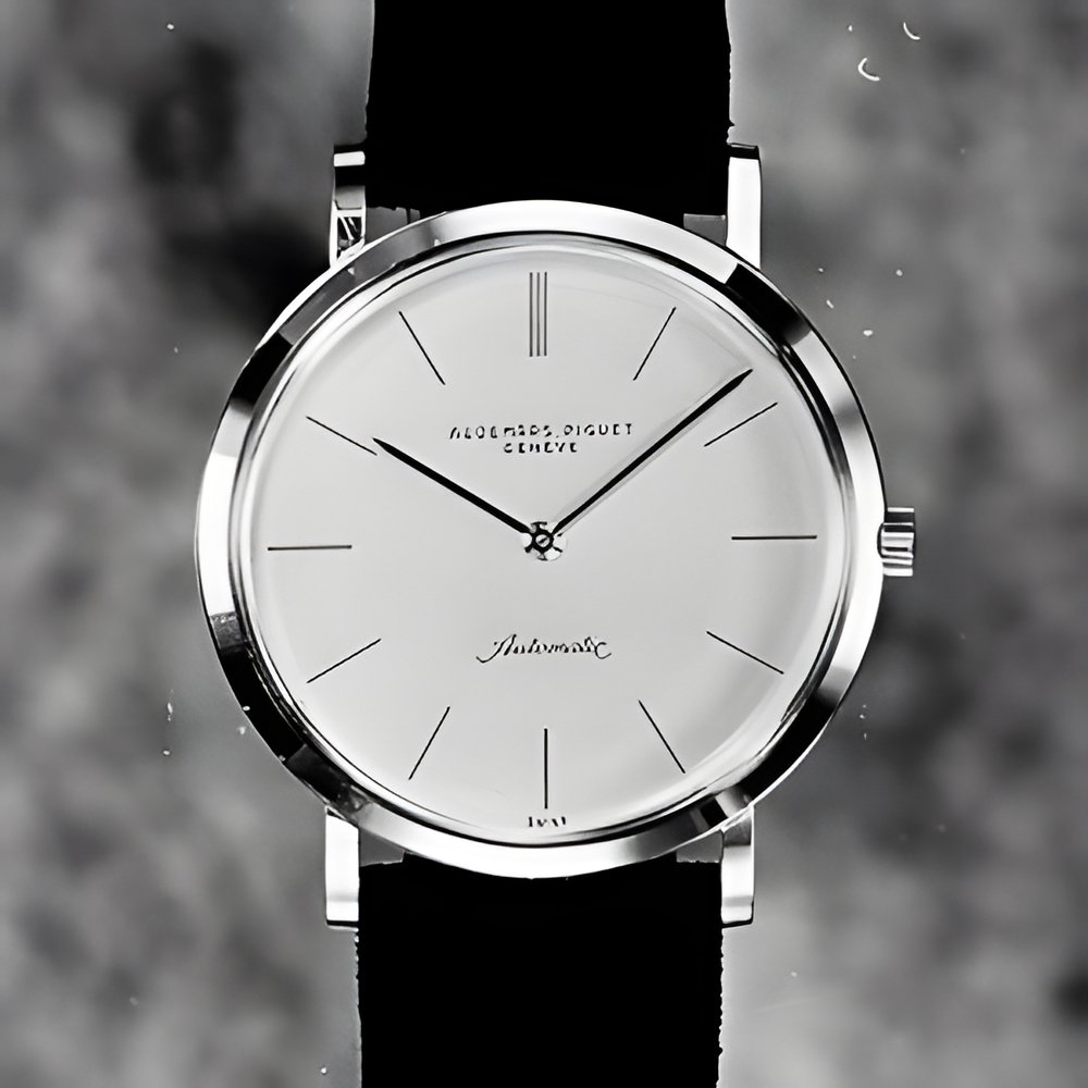 The Audemars, Piguet watches shown at Basle, this year have a new extra-slim automatic movement, the slimmest made with a complete (centred) rotor Total height on rotor 2.45 mm Other striking characteristics of this most interesting movement are as follows., 21 st. gold rotor turning on a bearing fitted with ruby runners with a guiding arid support rail allowing the centre axle to be lightened. The watch incorporated a total of 36 jewels, 18 of them for the self-winding mechanism. Large, variable inertia balance-wheel with a diameter of 8G4 mm. Shock-absorber. Mobile stud-holder. Jewelled reversera Reducer on steel ball-bearings. (AUDEMARS PIGUET)