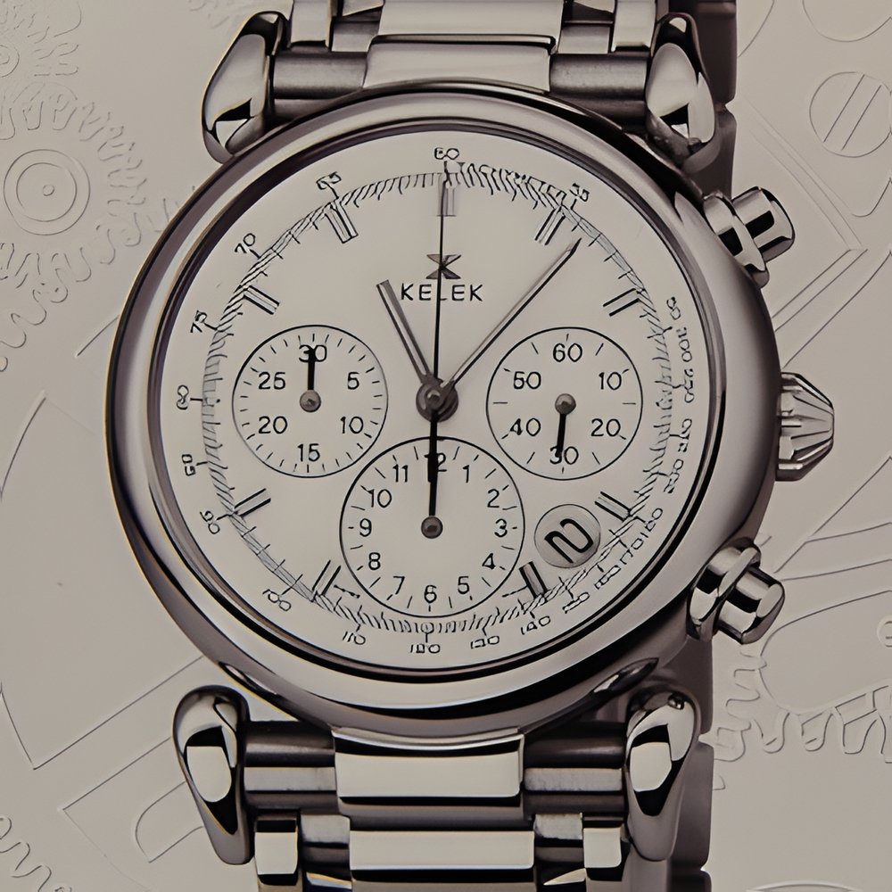 One of the smallest automatic chronographs on the market, with date and 30-minute, 12-hour and small seconds counters. Its 38-ruby, high-frequency movement is finely adjusted (4 positions) and richly decorated :rhodiumplated with circular-grained bridges and snailed undercuts. Côtes de Genève rotor engraved with «Kelek», Glucydur balance wheel, polished screw heads. Stainless steel bracelet and case with mobile horns. Dial with appliques and sapphire crystal.