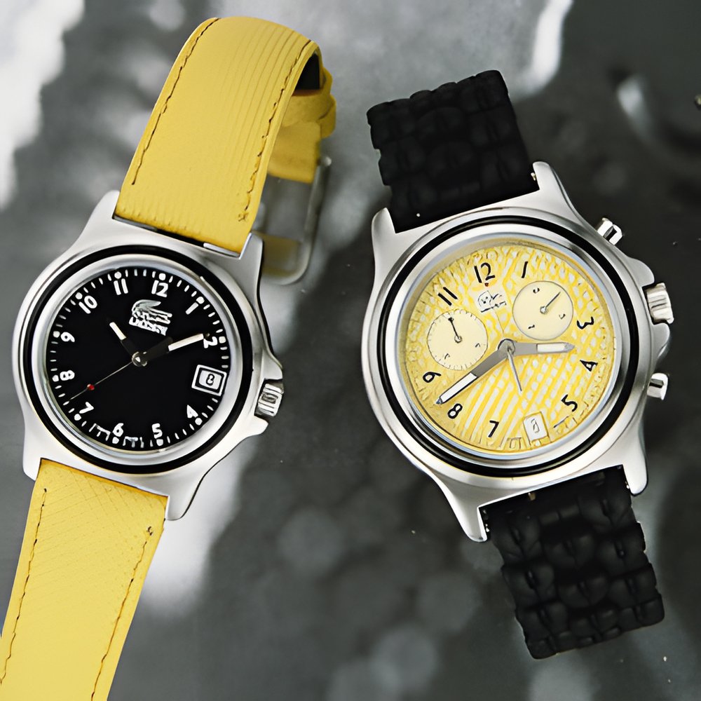 This new steel model, with a screw-down back, is water-resistant to 100 m and available in several versions: chronograph or watch with 3 hands and date indicator; ladies’, men’s and junior sizes; with a steel bracelet or coloured strap featuring the famous Lacoste stitch pattern (white, red, green, blue, yellow or black in leather or synthetic material). Quartz, Swiss-made and individually numbered.