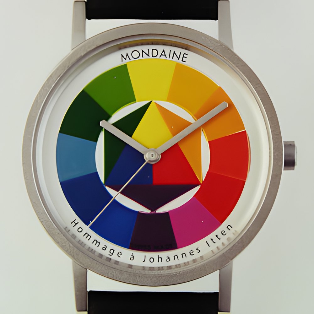 A colourful watch inspired by the work of Johannes Itten, the renowned painter and teacher in the 1920’s at the Bauhaus, which strongly influenced modem architecture and design. Styled on his chromatic paintings, the dial is divided into twelve different-coloured circular segments. The 100% recycled metal case is fitted with a quartz movement. Model delivered with a copy of Mrs. Itten’s official authorization. International 2-year guarantee.