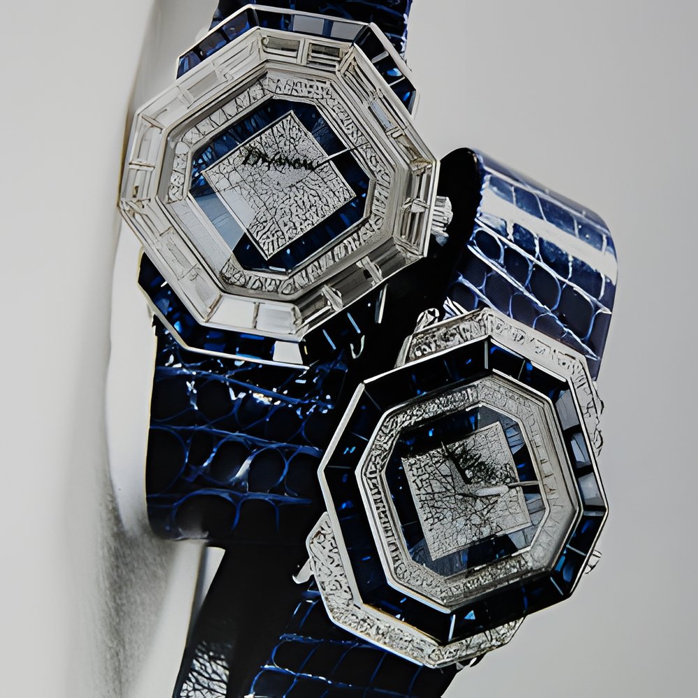 Two octagonal cases outlined with baguette stones : diamonds (5.90 ct) on the bezel and sapphires (4.60 Ct) on the attachments and dial for one; sapphires (8 Ct) on the bezel and dial for the other. These men’s models, adorned with brilliants and protected by a sapphire crystal, come in 750 (18K) gold. Handset, polished stones. Also available with rubies or emeralds.