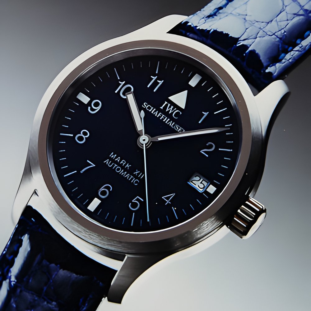 The king of aviator watches, this solid platinum model with blue dial and matching blue hand-sewn leather strap has been produced in a numbered series of 500. The 884 calibre automatic movement, with bi-directional rotor and 38-hour power-reserve, can be adjusted in 5 positions and is protected from magnetic fields by a soft iron inner case. Date with rapid advance and stop second. Water-resistant to 50 m. Screw-down crown. Sapphire crystal (grade 9 hardness).