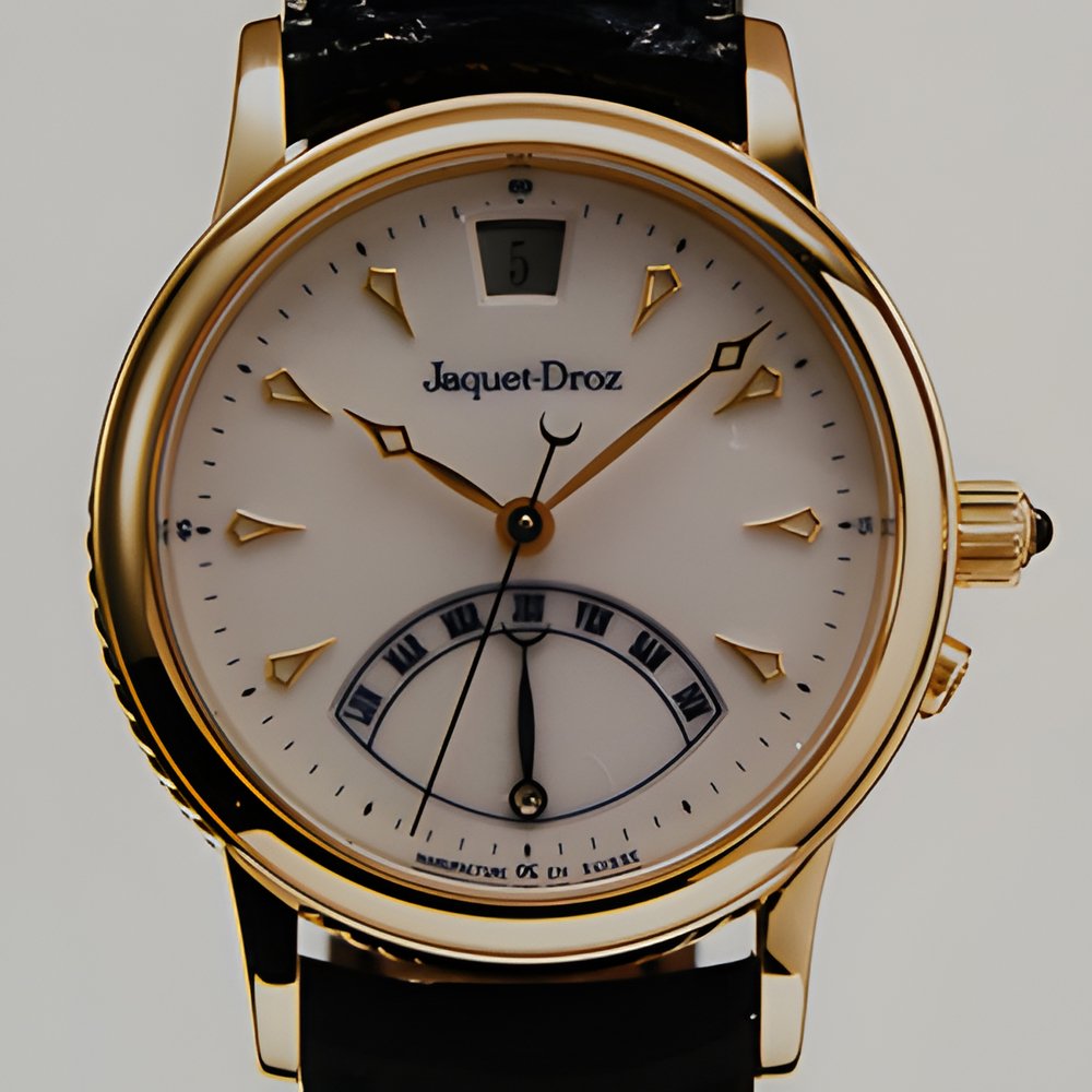In tribute to Pierre Jaquet-Droz, the brilliant 18th century watchmaker and engineer, the brand which bears his name has been inspired by the technical and aesthetic creations that made his reputation from Europe to Asia : complications, automata, godroons, open-work lozenge hands and enamel motifs. This men’s yellow gold watch on a leather strap features an automatic movement and has a centre seconds hand, date, retrograde week and transparent back. The porcelain dial comes with original hands and hour markers. The crown is set with a coloured stone. Numbered pieces.