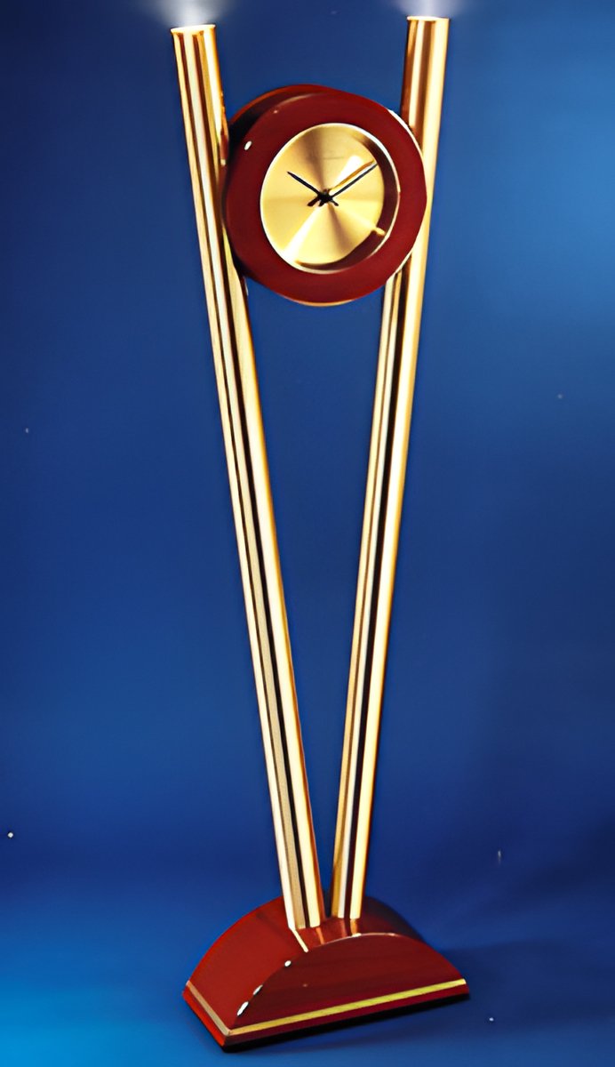 Two gilt brass cylinders, forming a V to support a designer clock with an acajou bezel, soar from a half-moon base of precious wood decorated with brass inlays. The halogen lamp in each cylinder is regulated by a modulator. The clock features a radio-controlled movement, and both the time as well as summer and winter time are set automatically from the nearest chronometric observatory. Width: 513 mm; depth: 220 mm; height: 1,866 mm.