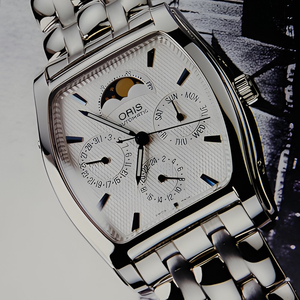 The tonneau shape takes on a new look in this model. The steel case with engraved back is fitted with an Ons 581 automatic movement indicating the moon phases, day, date and time in a second 24-hour time-zone. The guilloché dial features luminous hands and hour markers under a spherical cut mineral crystal. Water-resistant to 30 m. Comes on a matching bracelet with invisible folding clasp or on a leather strap.