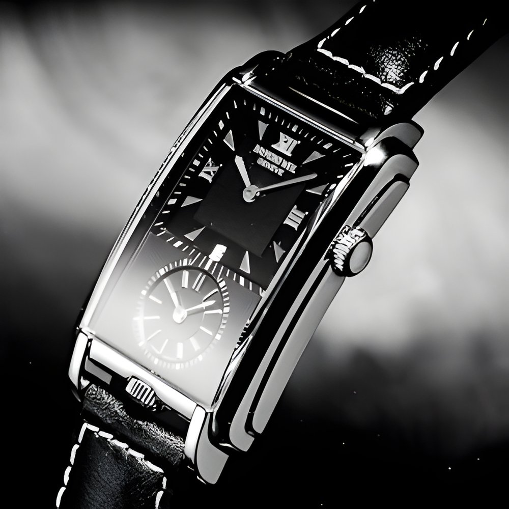 This rectangular model has a polished, stainless steel case. Equipped with two quartz movements, it gives the time in two time-zones on two dials, one of which features a date window at 6 o’clock. The blue, «Clous de Paris» dial has steel hour markers and Arabic numerals under a cambered, high-resistance mineral crystal. Water-resistant to 30 m. Roll-edged, saddle-stitched, genuine leather, blue strap with buckle.