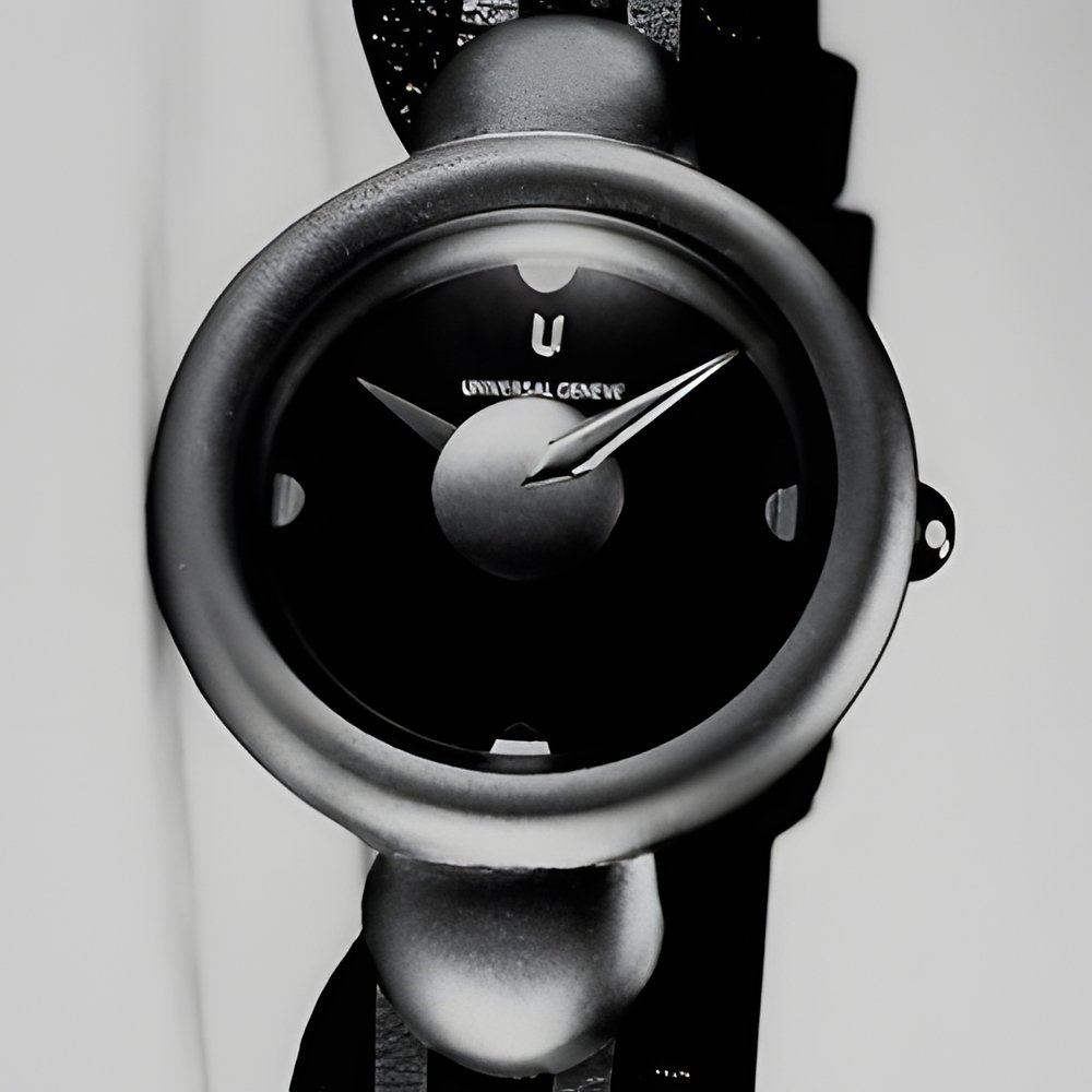 This watch is the first of a new collection dedicated to the women of the nineties. In monochrome greys, it has a matt steel case equipped with a quartz UG 48 movement. The dial, with spherical-shaped Dauphine hands, is stamped with an applique «U» logo. Water-resistant to 30 m. Sapphire crystal. Genuine leather strap with steel folding clasp.