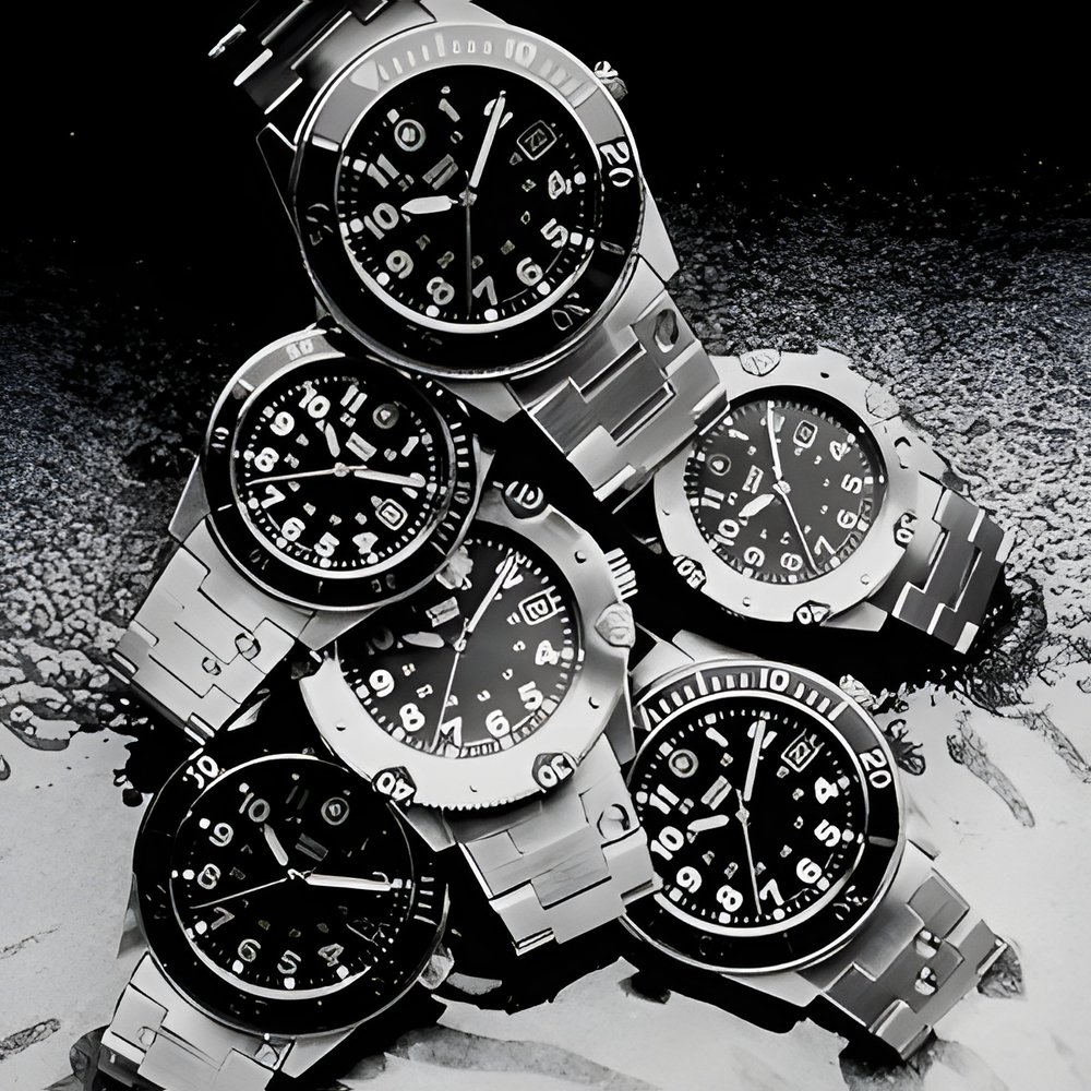 These models with rotating bezels feature countdown functions. Equipped with quartz movements, they are available in stainless steel or bimetallic (steel/10-micron gold-plated) versions, and have luminescent hands and hour markers, date calendar window, and sweep seconds-hand under a hardened mineral crystal. Water-resistant to 100 m, the Lancer 100 comes with a red, green, blue or black dial. The Lancer 200 is water-resistant to 200 in and features a screw-down back and crown. Both have stainless steel or bimetallic solid-link bracelets, with a wetsuit extension.