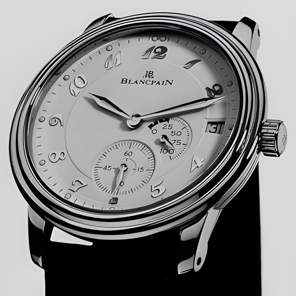 The new 2000 model is the same, yet different. It has the same shaped case, ultra-slim hand-wound complicated movement, date at 3 o’clock and noble materials. New features include the Blancpain Arabic numerals on a white or black dial, and the superposing of two counters small seconds at 6 o’clock and 100-hour powerreserve at 4 o’clock. Available in 750 (18K) yellow gold or stainless steel on a matching bracelet or leather strap, it is water-resistant to 30 m.