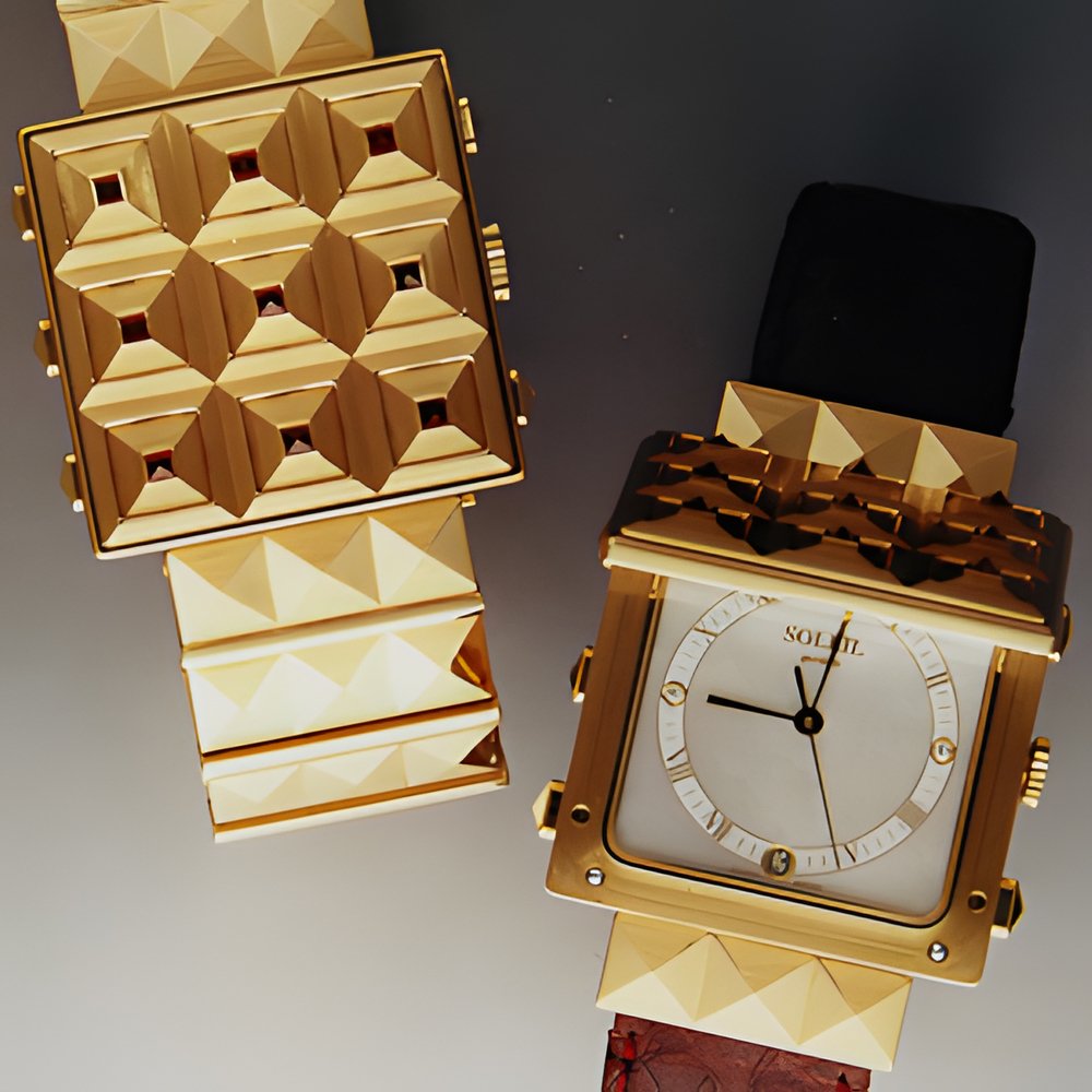 On this fascinating watch, the mother-of-pearl dial is hidden under a cover decorated with mysterious pyramids, which are in 750 (18K) gold set with stones (here with 9 rubies), in black ceramic on a gold base, or in stainless steel. The cover hinge, weighing a mere 0.02 g, can be opened a minimum of 30,000 times and will last 10 years. Models available with ETA automatic or quartz movement.