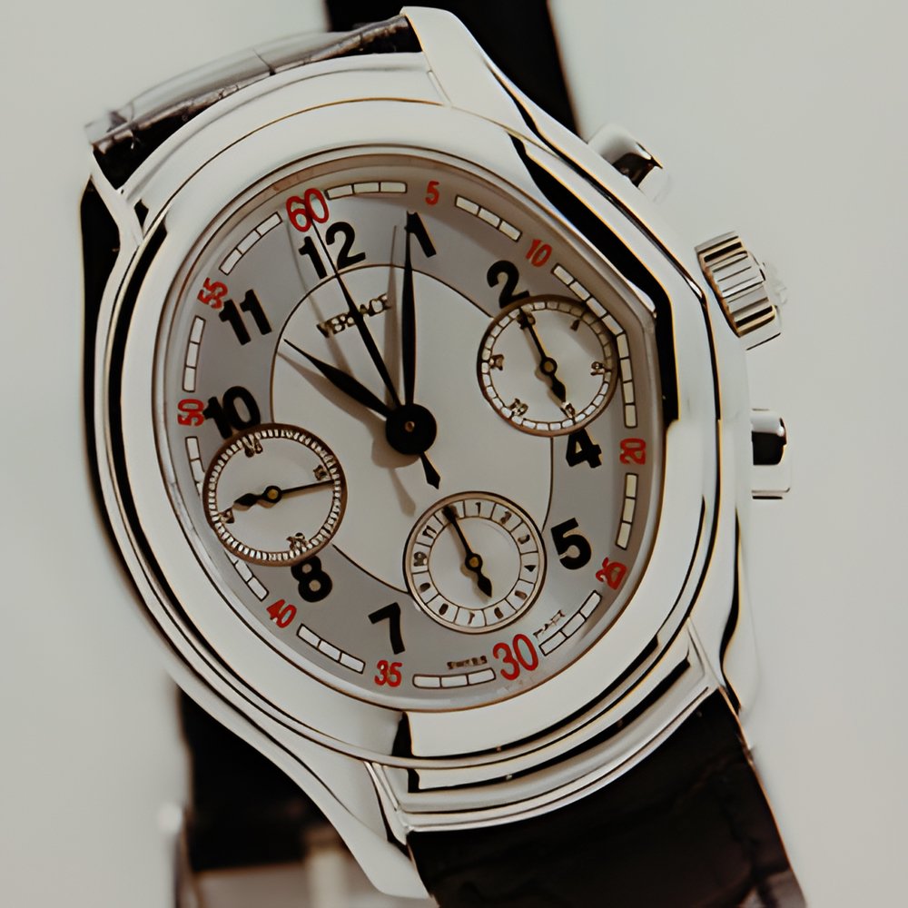 GV Gioielli makes its entrance into the world of watches with two personalized lines. This model from the Modern collection is a medium-sized automatic chronograph equipped with the FM 7000 CC calibre movement, which has a 42-hour power reserve. The specially decorated white dial bearing the Versace signature features black straight numbers, a burgundy minute circle and three sub-dials 30 minutes at 3 o’clock, 12 hours at 6 o’clock and small seconds at 9 o’clock - embellished with nickelplated filets. This steel version is water-resistant to 30 rn and comes on a crocodile strap with a steel buckle. Limited series of 250 pieces, numbered and engraved with Gianni Versace on the caseback.