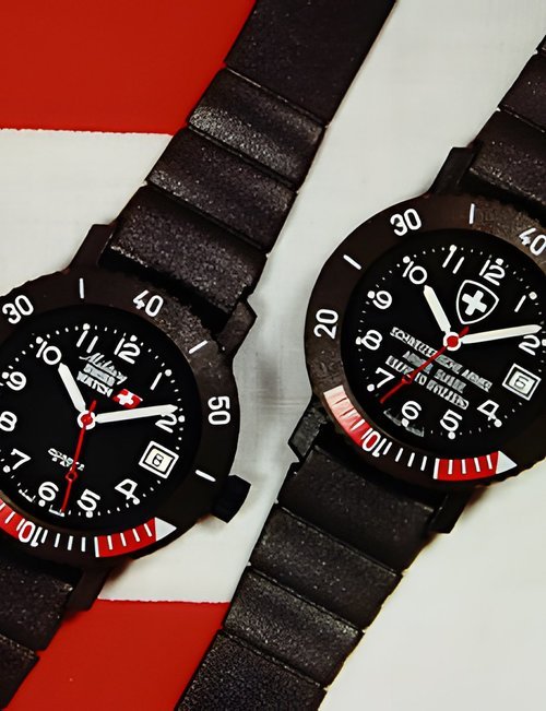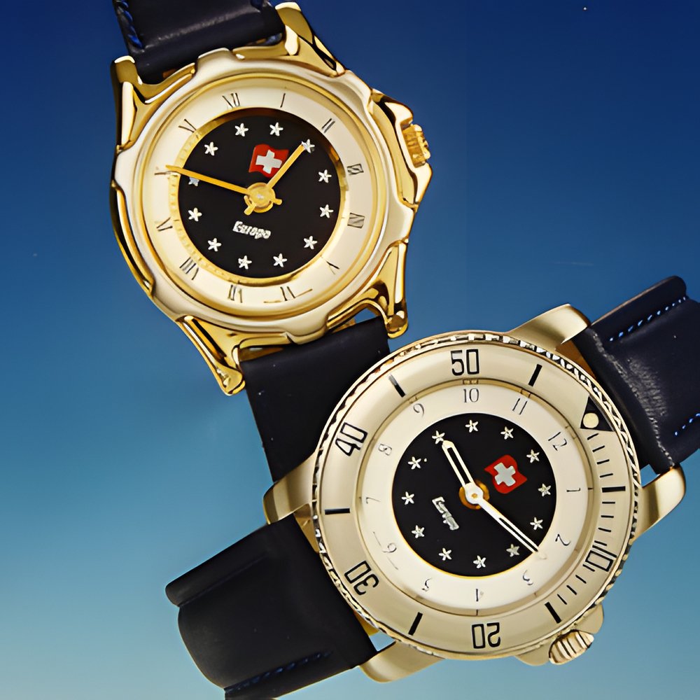 This watch, which bears the colours of Europe, has an original feature: the dial’s starred centre turns at 120 pulsations a minute. Bimetallic version for town wear, steel version for sports wear. Quartz movement. Back engraved with Ulystar. Blue leather strap.