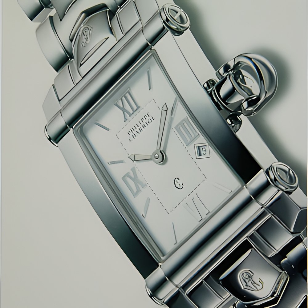 Cut from a block of metal, this cambered rectangular watch is enhanced by four exposed screws and decorated with a shackle on the winding crown. The case, which is water-resistant to 30 m, has a screwdown back and is fitted with a Swiss automatic or quartz movement. Available in steel, 750 (18K) gold or bimetallic versions on a matching metal bracelet or a calfskin leather strap with steel folding clasp.