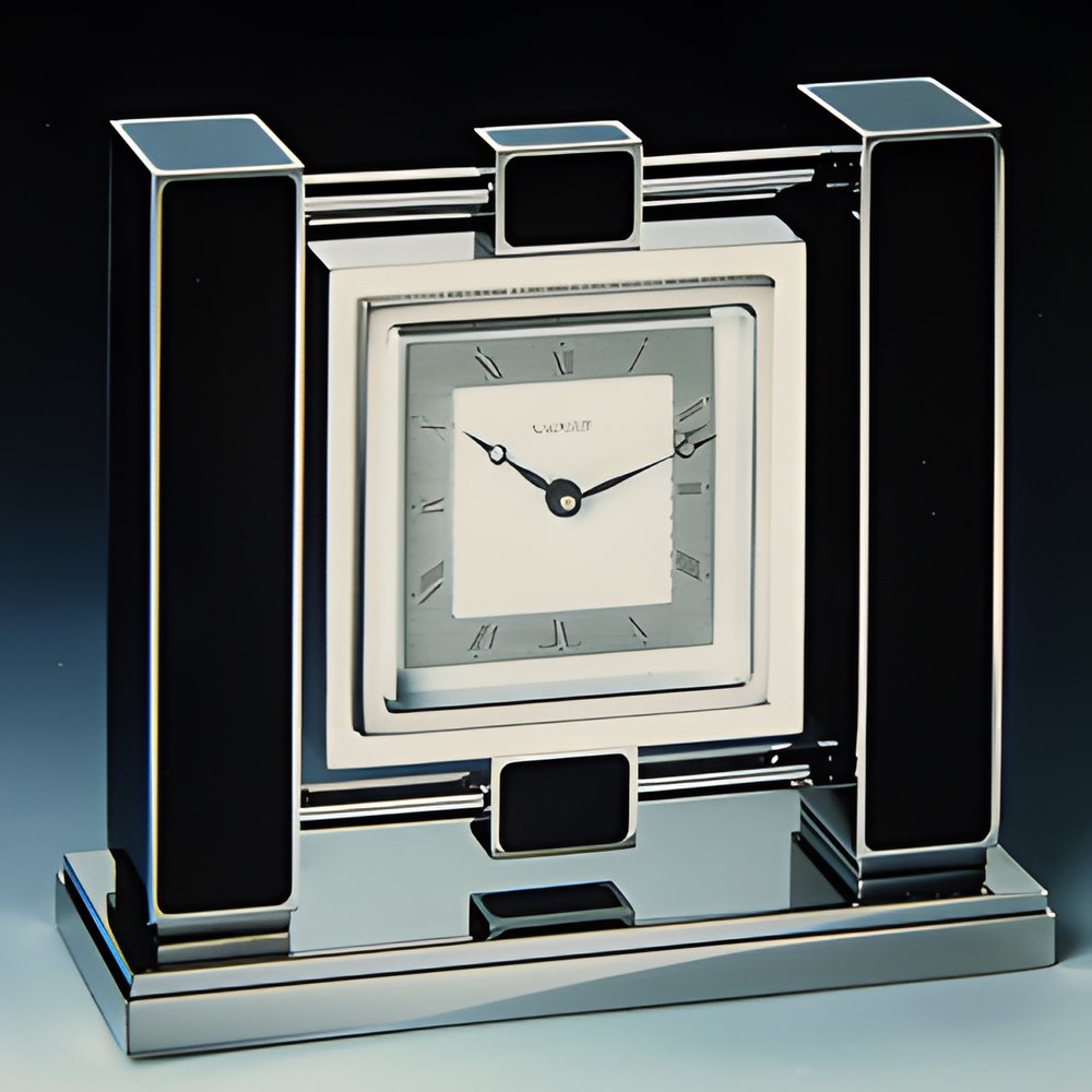 This geometrically styled clock is sculpted in hand-polished solid brass. Its 12.5 cm case is highlighted with lacquered surfaces, cloisonné with palladium or gilt edges. High quality, Swiss Made quartz movement.