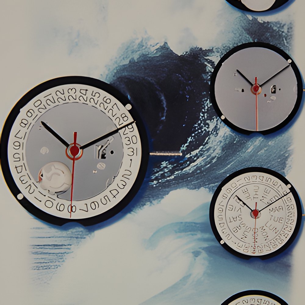 The new Powertech line is equipped with a powerful motor (typical l3pNm). These quartz movements - 10V2" and 111/2... in diameter, 3 mm in height and 1.5 mm high at the stem - are available in different, interchangeable versions: two hands, three hands, date, day-date with rapid correction, and date with 24-hour indicator.