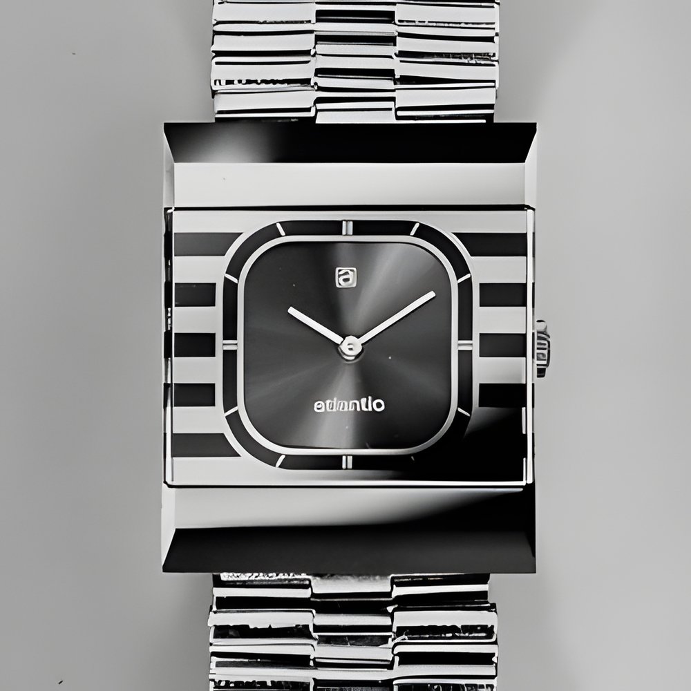 Boldly masculine quartz watch with decisive straight-line styling enhanced by a round dial aperture. Water-resistant and scratchresistant case with scratch-resistant mineral crystal. (ATLANTIC “Monolith”)
