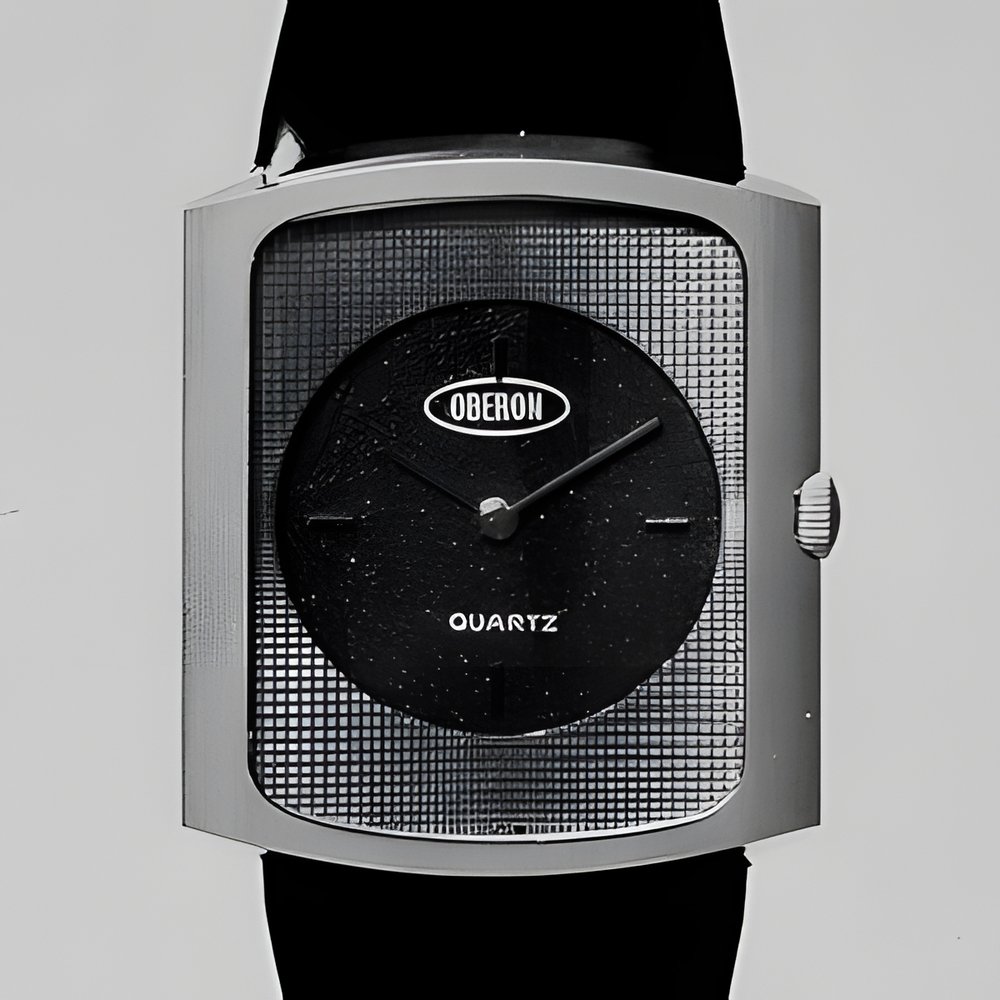 A quartz-piloted model with original styling : straight outer case lines contrasting with a round dial within a curved dial. (OBERON)